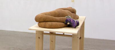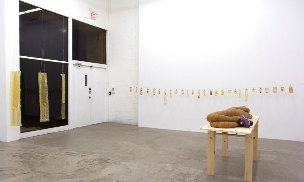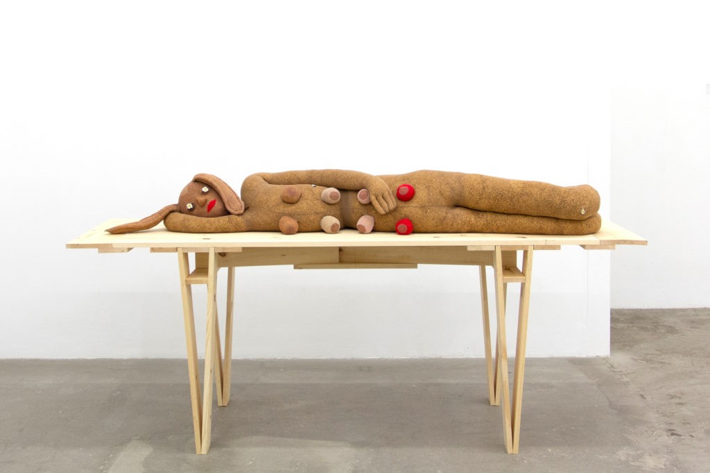 When you walk into the gallery, there is a life-size human-like bunny made of tobacco wrapped in pantyhose lying on a table. As you turn to the back, you would be surprised that it wears a pair of old running shoes, a staple for a busy mom. The bunny has feminine characteristics with eight nipples, red lipstick, and two long ears resembling long hair. This sculptural work is made by Gabrielle L’Hirondelle Hill whose “works have used found and readily-sourced materials to address concepts such as private property, exchange, and black-market economics.”