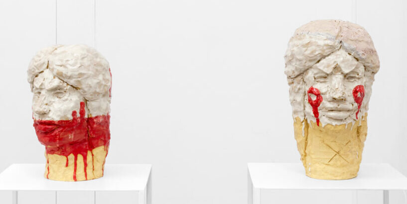 Installation view Separate/Together with Raven Halfmoon, Sah-Cooh II, 2022, Stoneware, glaze, 9″ x 7″ x 6″ (left) and Sah-Cooh I, 2022, Stoneware, glaze, 12″ x 8″ x 7″ (right)