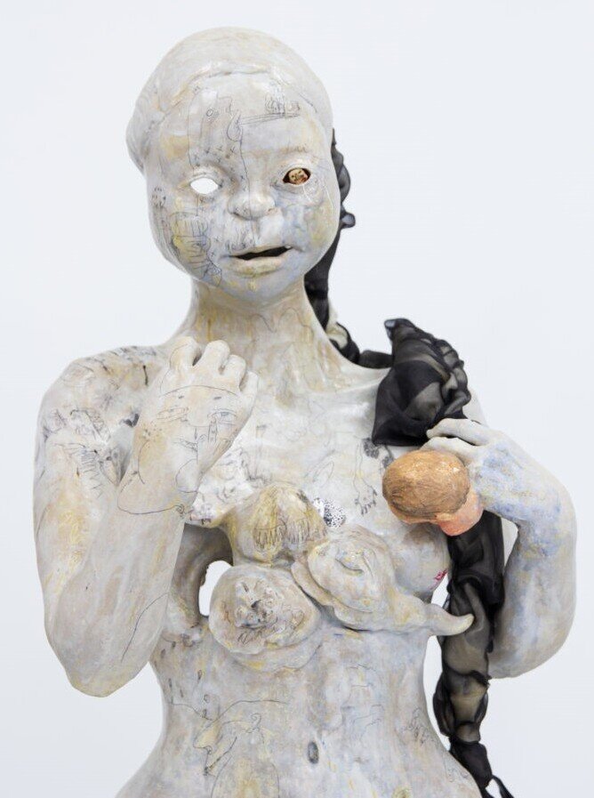 Sami Tsang, Still We Rise, 2020, stoneware, glaze, underglaze, resin, clay epoxy, polymer clay, ballpoint pen, pencil, fabric, 31’’x 20’’ x 14”