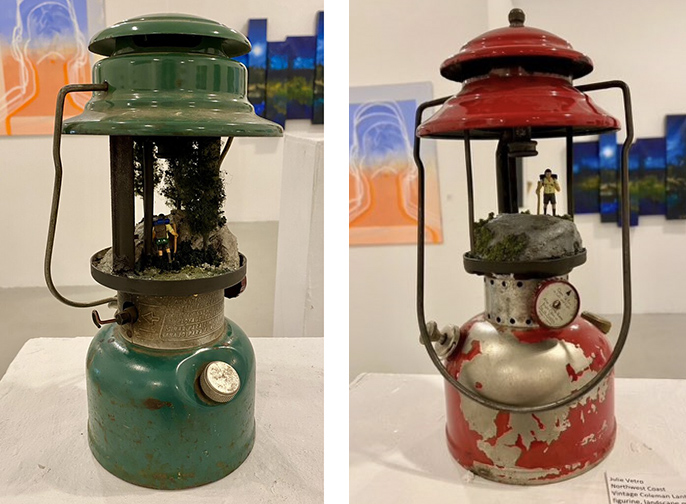 Julie Vetro, Northwest Coast (left) & Arctic (right) both 2018, Vintage Coleman Lantern, miniature hiker figurine, landscape materials, 5” x 5” x 12”. Photo: Jennifer Boothby