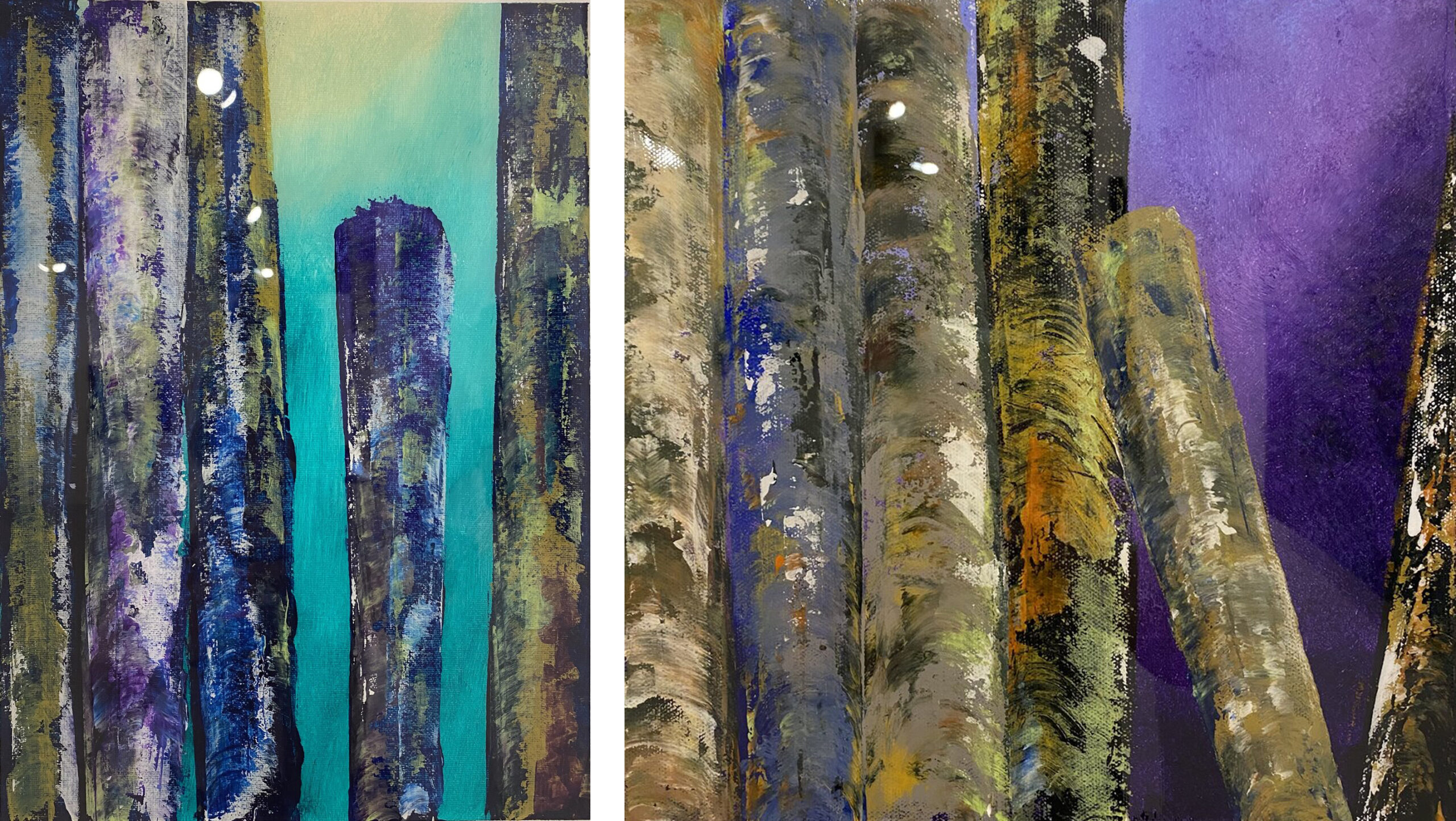 While contemplating the paintings, I found a sense of peace and serenity wash over me, as I imagined standing alone among the trees at twilight, listening to the sounds of the forest, and looking upwards to glimpse the sky through the dense trunks. The cool tones of the teal and purple skies might prompt viewers to imagine a breeze gently whistling through the trees.