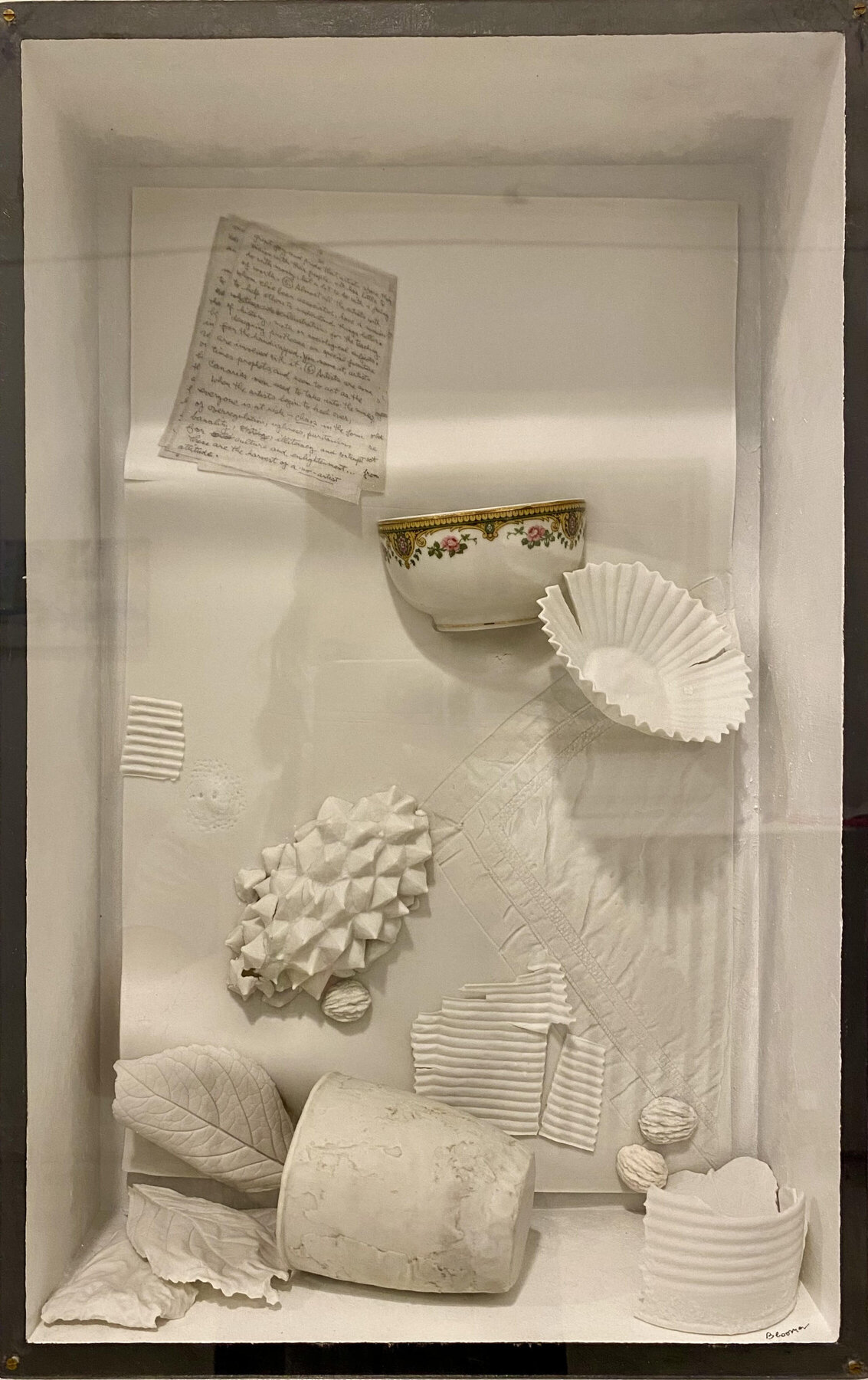 Alongside themes of nostalgia and preservation, the sculpture evokes the surreal. Each object has been slightly distorted, leaving viewers with a sense that something is not quite right. The tumbler at the bottom of the frame lies on its side, decaying. The handwritten notes appear to have been shrunken. The teacup’s interior is lined with 24 carat gold leaf and is embedded in the background. Even the paper lining the background of the frame is slightly crumpled. Additionally, most of the objects have been made of white porcelain, which enhances the sense of preservation, but also makes the entire arrangement seem unnatural.