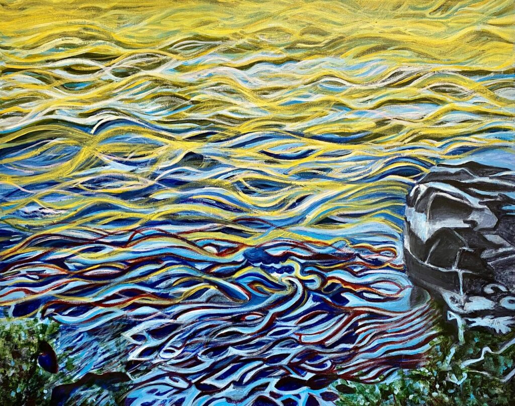 Similarly, in Dancing Water No. 2, Joan Haberman has created a dream-like waterscape, using vibrant colours and playful brushstrokes. From afar, the yellows at the top of the painting evoke sun reflecting off the waves on a clear day, while the dark blues near the bottom recall shadows closer to the viewer standing on shore. As viewers move closer to the painting, however, a much more varied colour palette emerges. Haberman has woven an intricate pattern of reds, pinks, and browns through the water—creating a sense of depth, and making the waves appear to dance across the canvas.
