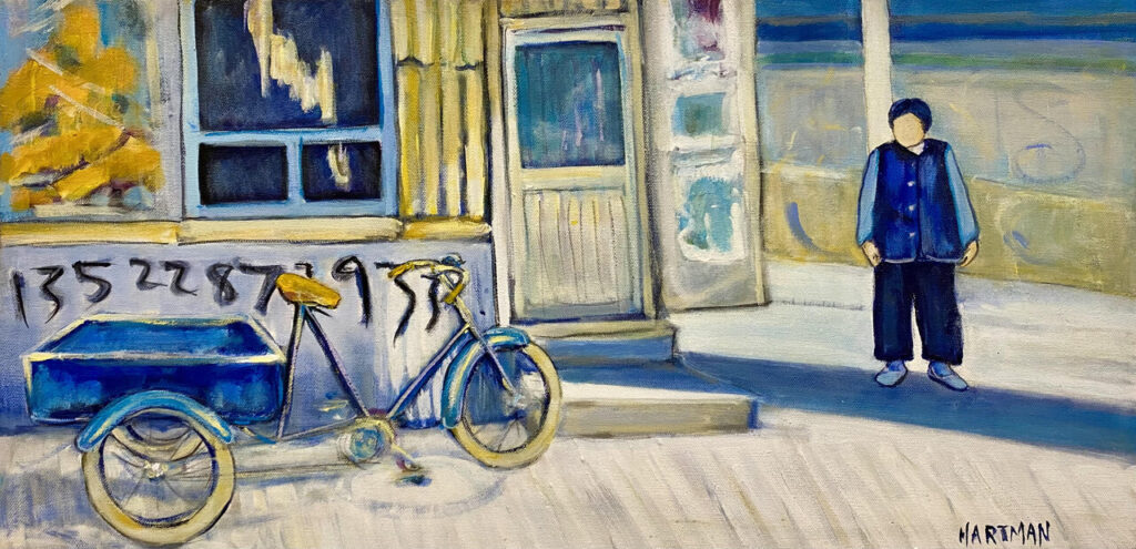 Similarly, Ruth Hartman’s painting Beijing Blue, conveys a sense of isolation through the colour palette and solitary figure. Viewers can again transpose themselves onto the faceless figure, evoking what Hartman refers to as the, “universal within the individual.” Additionally, the predominantly blue colour palette heightens the sense of loneliness.