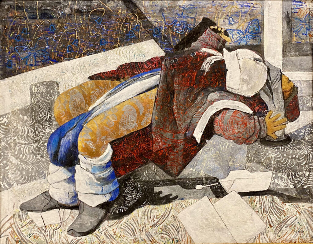 Treloar’s TTC Shelter portrays a familiar image of a person lying alone on a subway bench, debris strewn at his feet. The figure is bundled up in winter clothing, but appears disheveled, with his coat blown open and shoelaces undone. In the everyday hustle and bustle of the subway, a person lying on a bench would not typically draw our eyes, however, Treloar has monumentalized the scene through her use of colour and fabric. The figure’s vibrant red, blue, and gold clothing contrasts his bleak grey and white surroundings, and makes the figure stand out. Additionally, Treloar’s incorporation of fabric creates an interesting clash between the figure’s disheveled appearance and the luxurious fabric patterns that adorn his clothing.
