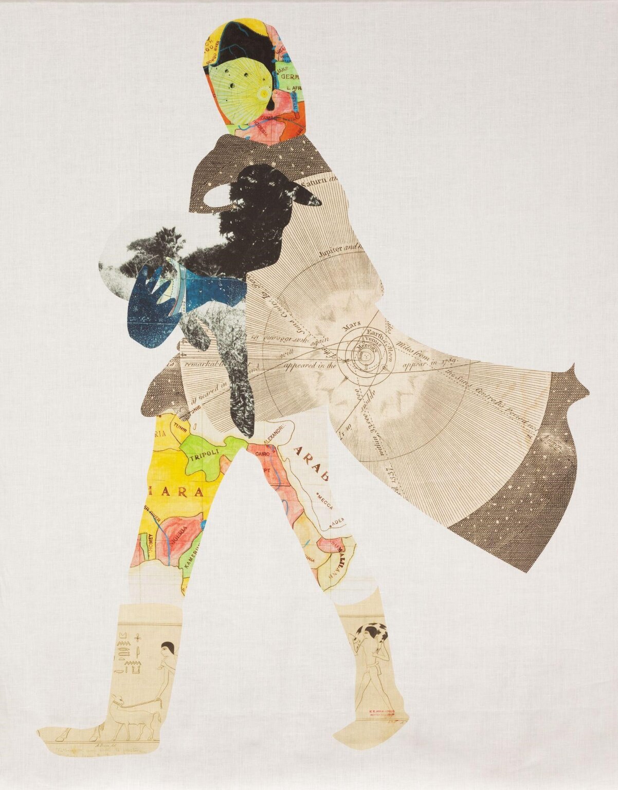 In Anna Binta Diallo’s collage Boy with Lamb, scraps of various fragments, that not related by any means, have been collected and harmonized into a composition. The shepherd is walking straight ahead with his cape flying in the wind. He turns his face towards the viewer with a little black lamb laying in his arms. The robe and the face of the shepherd is made of an early heliocentric illustration. His thighs are covered in parts of the map of Arabia. Diallo combines different geographical and cosmic motifs in her work, involving elements from both the past and the present. Sacrificing animals has a long history. The shepherd’s boots are ancient Egyptian frescos showing men leading a lamb on a leash or carrying it over his shoulder. In Christianity, the lamb is a sacrificial animal, symbolizing our sins and our cleansing by its blood sacrifice. The lamb is a complex symbol that also can stand for the possibility of life, riches and peace. This collage uses various religious elements, showing Diallo’s migration history.