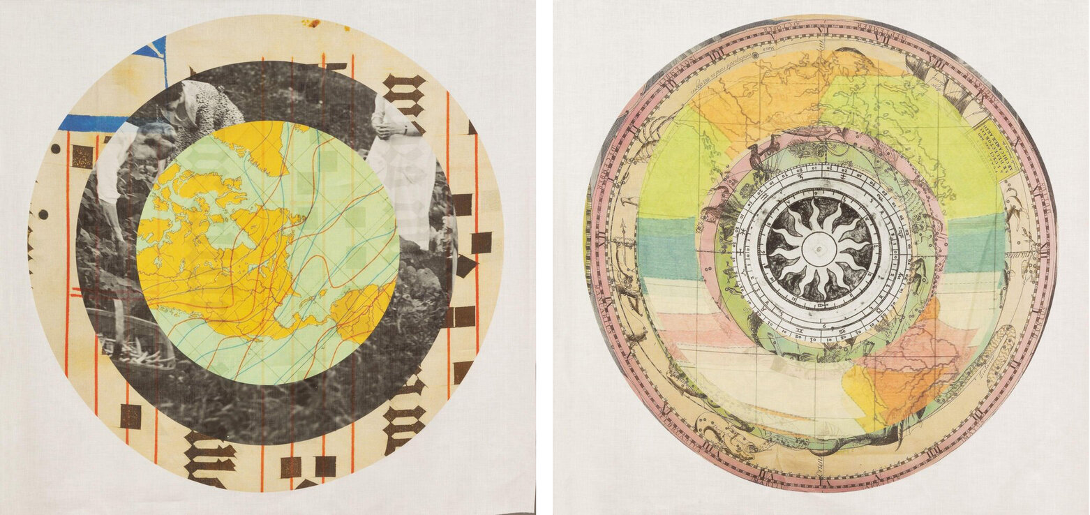 Anna Binta Diallo, Harvest Orbit (left) & Solar Orbit (right) both, digital collage printed on hemp, 44 x 44 inches