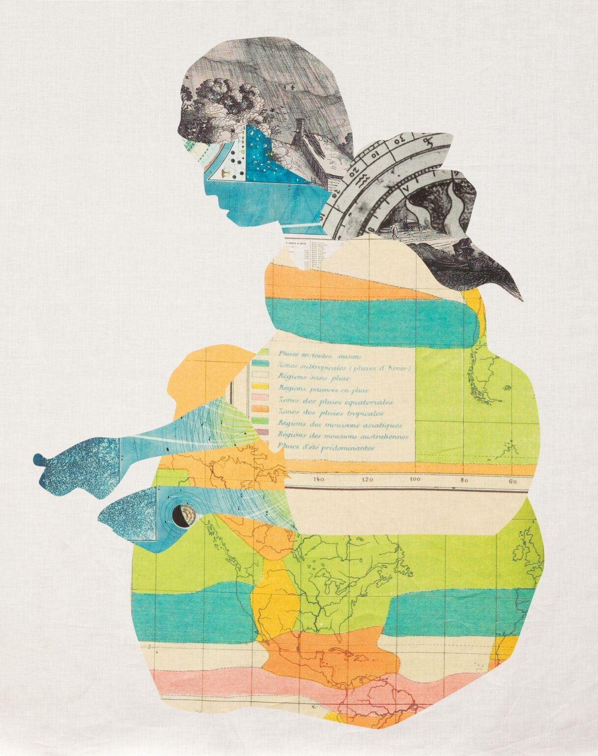 Seed Girl is an extremely complex, sophisticated image. At first sight we recognize the protractor in the girl’s head. Then we are attracted by her multi-coloured dress. The imagery immediately suggests geographical connections. The body is patterned by the latitudes and longitudes lines over a map of Africa. Diallo was born in Dakar, Senegal where the official language is French, so it comes as little surprise that the inscription in the middle of the composition is in French, describing aerography climate conditions. Those conditions highly affect the agriculture. The head and the hands of the figure are based on an image of the lunar chiaroscuro and the tracks formed by orbiting asteroids. Corresponding to the title of the collage, the plant located on the girl’s hand looks like a combination of a half open planet and a seed. The girl’s hair is made of an inserted engraving depicting the rural life of farmers in the past.