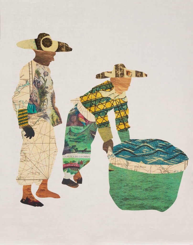 Anna Binta Diallo, Two fishermen, digital collage printed on hemp, 54 x 41 inches