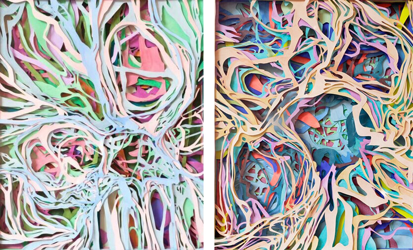 Bardo 2 (left) and Bardo 3 (right) both 2022, hand cut paper, watercolour, and gouache 24.75 x 20 x 2.75 inches