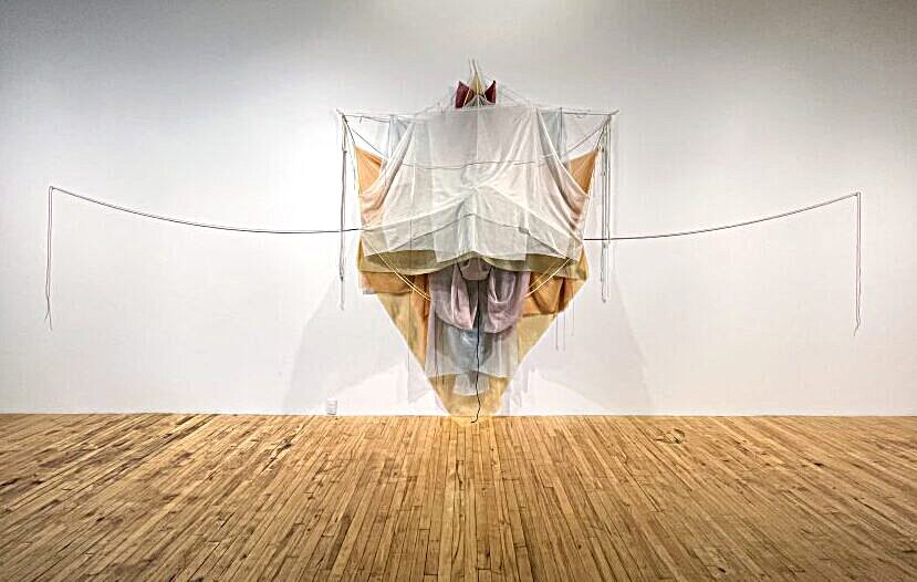 Never more stable than a rainbow, 2022, sheer curtain, rope, and curtain rod, variable dimensions