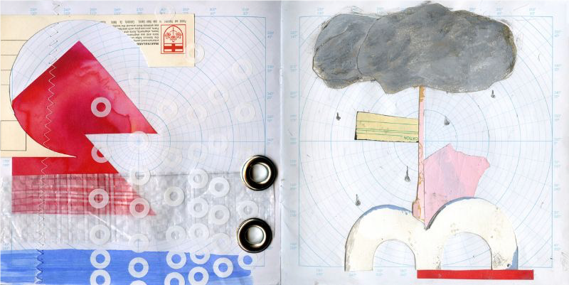 The grid is a set of rules – guides that the paper wants the artist to follow. Rye plays with these rules: sometimes she plays along, sometimes against. Each drawing includes a set of mouse-maze like walls seen from above, architecture that obediently follows the grid. But in other places Rye defies it. Pieces of geometry twist off in odd directions. Other grids, maps and printed patterns are collaged in, breaking the illusional space of the axial grid geometry.