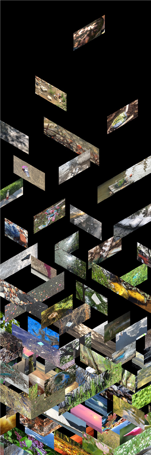 The other large piece, Suspended Meditation – Vertical is a tall image that contains the same kind of isometrically skewed scenes as in its horizontal sibling. In this case, gravity has taken hold and the colourful images are clustered towards the bottom while the top of the image is mostly empty. The densely packed images in the lower section are again taken from the found meditation nature footage. The images at the upper end of the frame are less colourful and depict nature tainted with trash and litter. The polluted images can be seen as falling over the idealized images. Rye is fascinated by how we sooth ourselves through the contemplation of aesthetic images of nature while we collectively treat the natural world in ways that are exploitive and far from reverential.