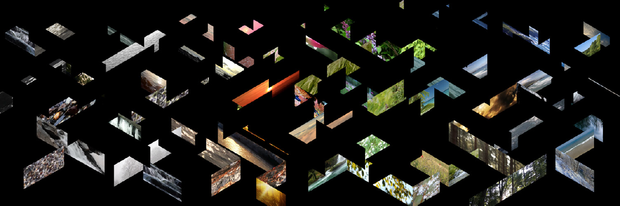 Suspended Meditation – Horizontal is a wide, panoramic digital print. Colorful image fragments float over a black background, aligned to an invisible isometric grid. The effect is like delicately stacked cards or intricately folded paper. Each shape contains an image of nature: sunset, vegetation, coastline, etc. Rye has taken these images from online meditation videos, videos that often contain idealized visions of nature; scenes that are carefully composed and colour enhanced. Because these images are skewed to conform to the isometric geometry, they do not appear as windows that we see through, but as floating two-dimensional membranes within the three-dimensional space. The orientation deflects our gaze, the pictorial illusion is thwarted. They remain as posters, wallpaper, or screens.