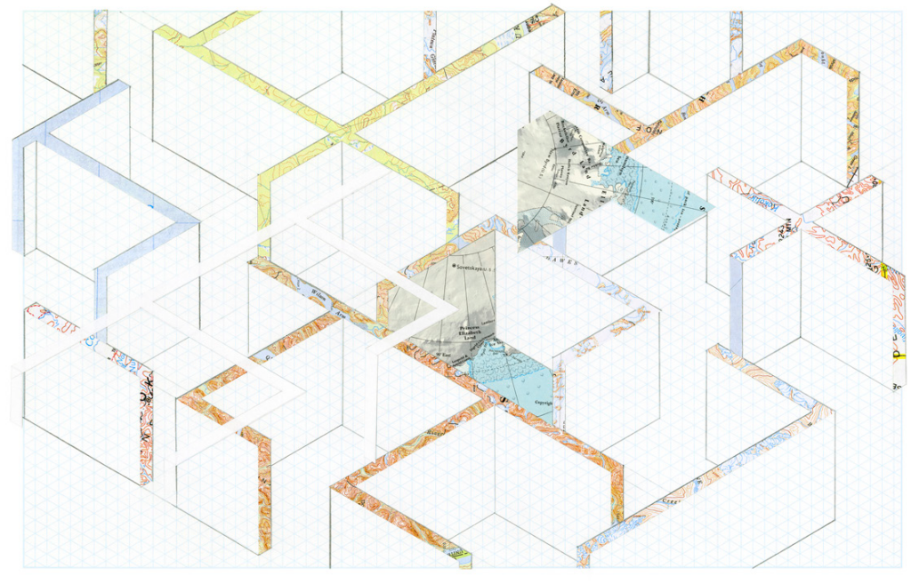 The Deviations are a set of prints of collage / drawings produced on isometric grid paper. This kind of grid, and the drawings they are designed to support, are typically used in architecture and engineering to represent three dimensional views of objects.