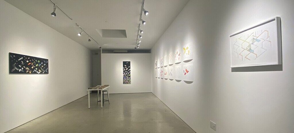 Rye’s show at General Hardware Contemporary is crisp and sleek. The show consists of three bodies of work: a pair of large digital prints with colourful flecks of images over a dark background, a set of notebooks filled with collaborative work, and fifteen prints reminiscent of architectural presentations.
