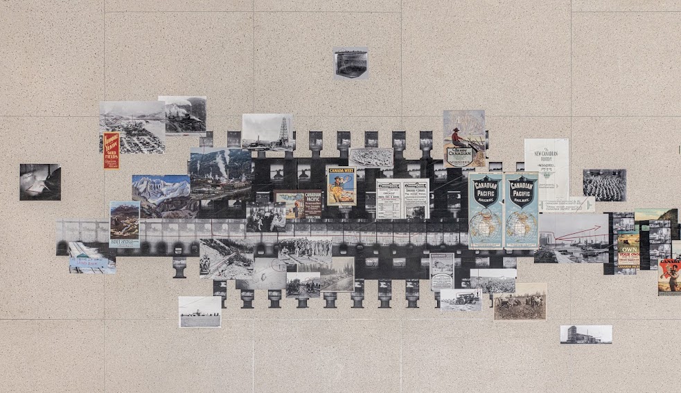 Artist Miles Rufelds’ work Annotations on a Profitable Enterprise (It spans the world) was commissioned for this exhibition specifically. The artist critically analyzes an important part of Canada’s archival history through his extensive research into the Canadian Pacific Railway. On the floor, like a scattering of archives, are a collection of images and posters used throughout the railway’s history, including historic union strikes, Canada’s history of mining, and propaganda posters enticing white settlers to travel to the western provinces. Maya Wilson-Sanchez explains, “it’s all here, truth is all on the surface for you to see, it is a thorough and story-like look at capitalism and colonization which are two sides of the same coin”.