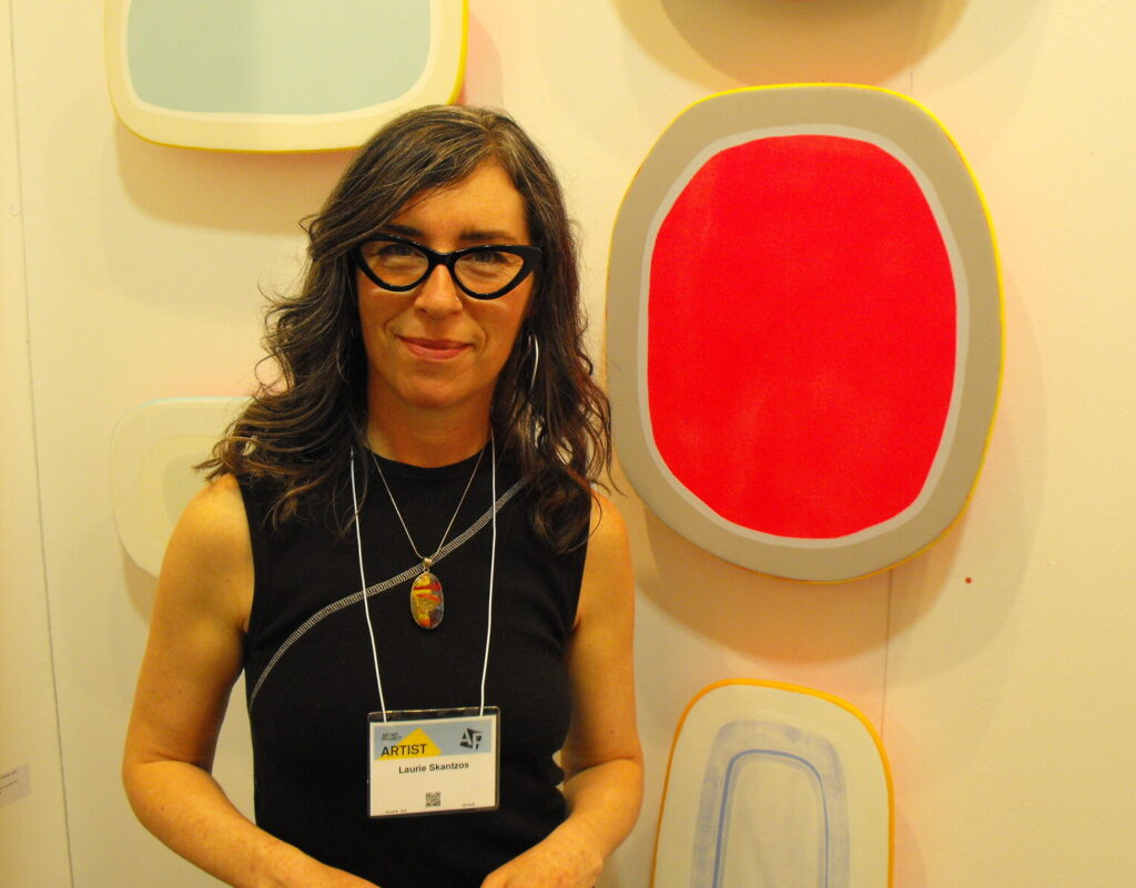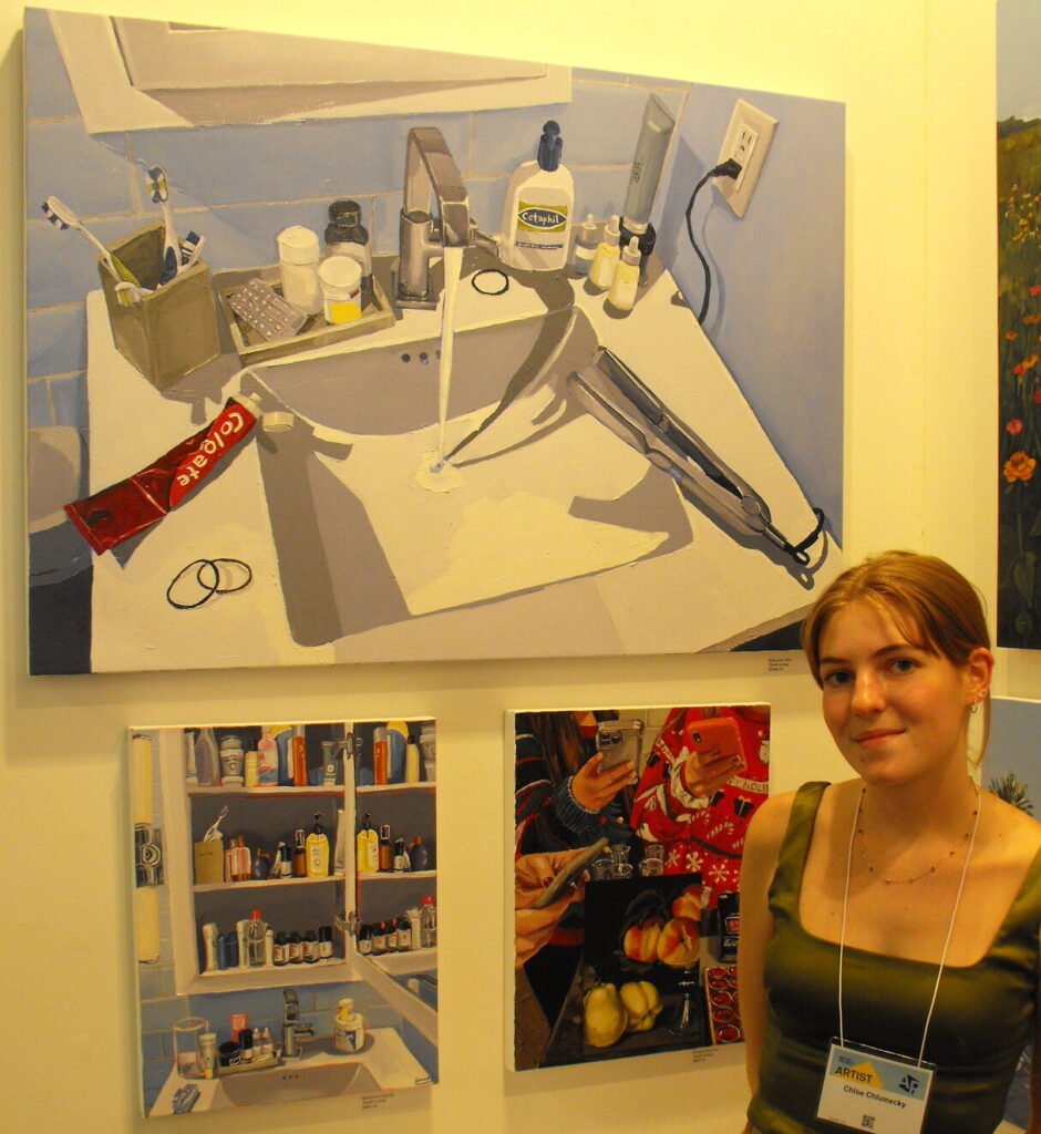 Sculptor, Morris Wazney uses bronze and was looking forward to more days at the Project and connecting with collectors. Painter, Jacques Descoteaux is back as part of the Project. I last saw him in the 2020 Artist Project. His paintings of skies are mesmerizing. Paul Brandejs combines sculpture and painting in his sculpted works. Artist Sandra Tarantino participated in the Project in the past and was already getting some sales. I talked with Amy Shackleton, a talented painter who moved to Oshawa from Toronto with her husband and family. She was having a good time being back in the Toronto art scene and had already made a few sales.
