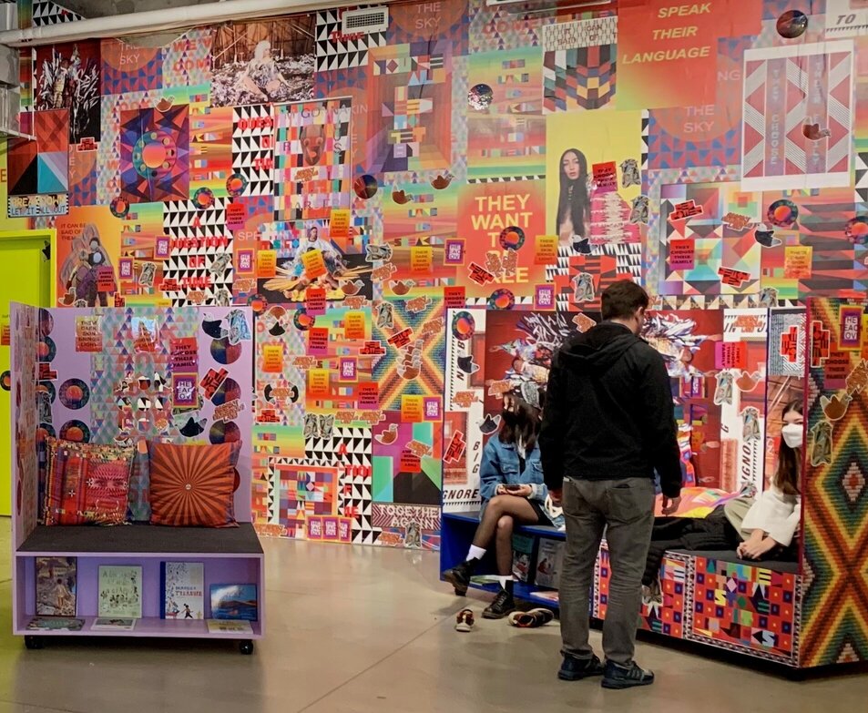 Jeffrey Gibson, a member of the Mississippi Band of Choctaw Indians and also half Cherokee, is an interdisciplinary artist based out of Hudson, New York. I AM YOUR RELATIVE draws inspiration and imagery from the artist’s past works as well as from community-sourced submissions, prioritizing Black, Brown, Indigenous and queer imagery. Gibson’s space is perfect for the thoughtful observer. Hours could be spent walking through the space to spot details, peer through cut-outs, read the books, and lie back against the patterned cushions. Slow-lookers will see stickers of beaded bird sculptures, stills from past video projects, children’s books about city planning, and phrases like “HE DRUMS IN THEIR FACE,” “RESPECT INDIGENOUS LAND,” and “KNOW YOU ARE LOVED.”