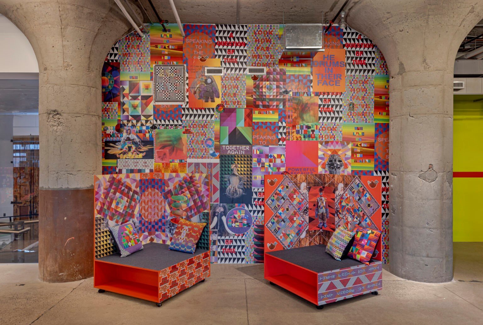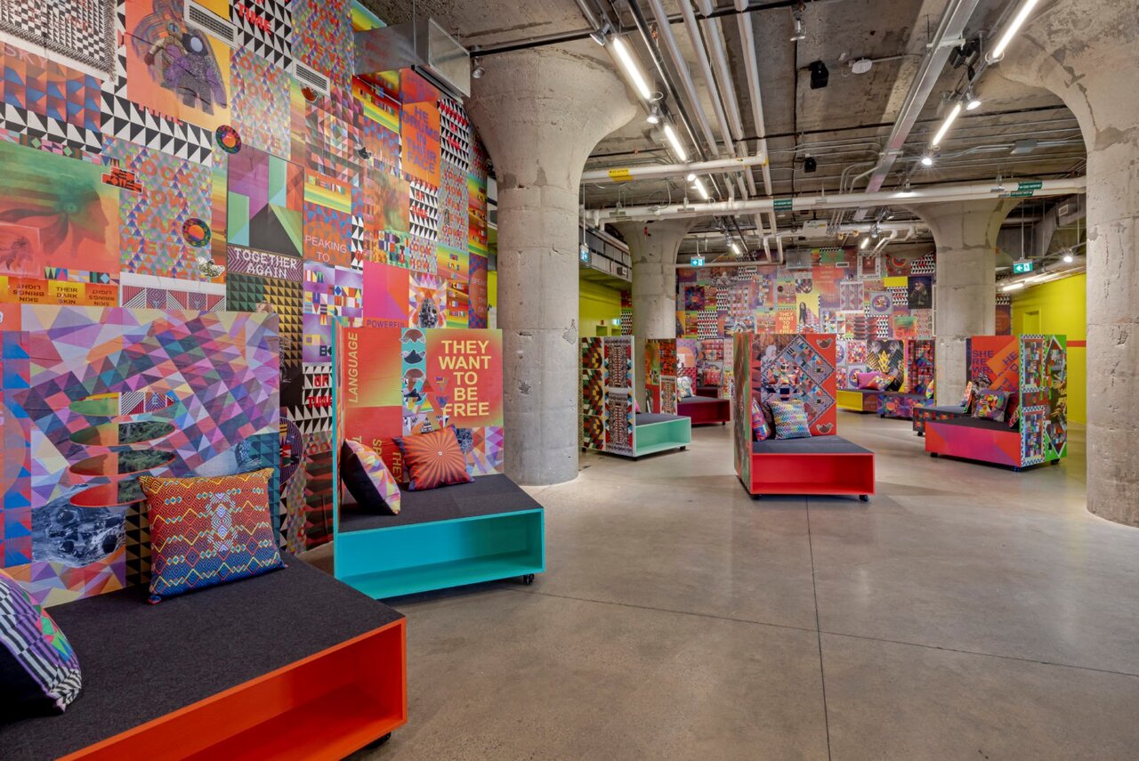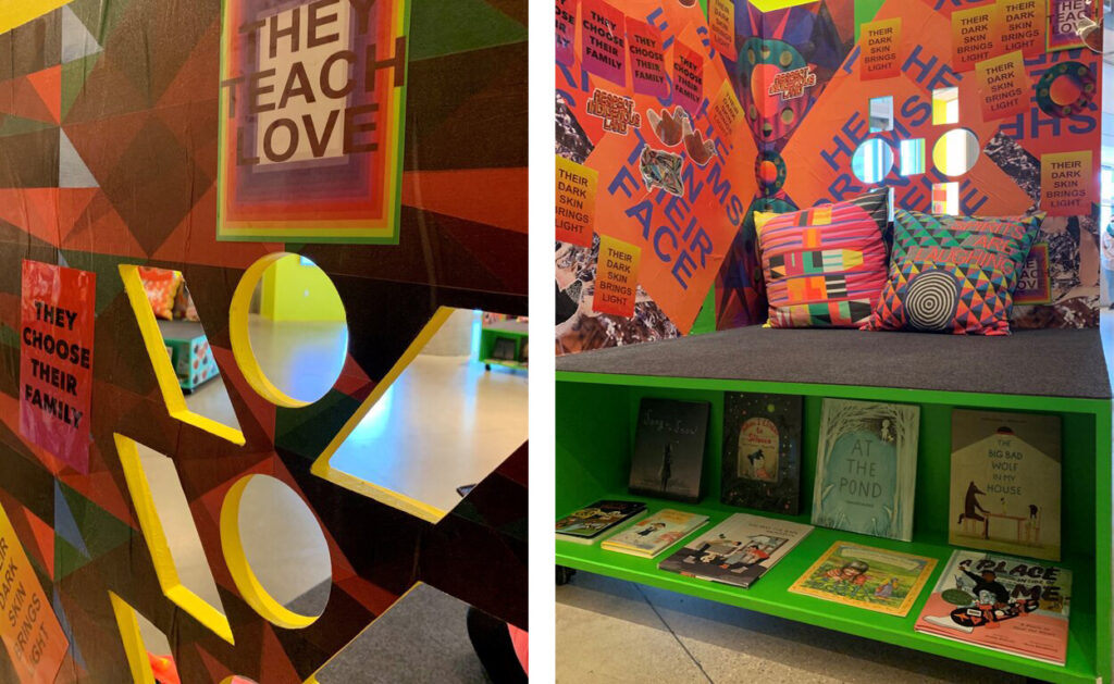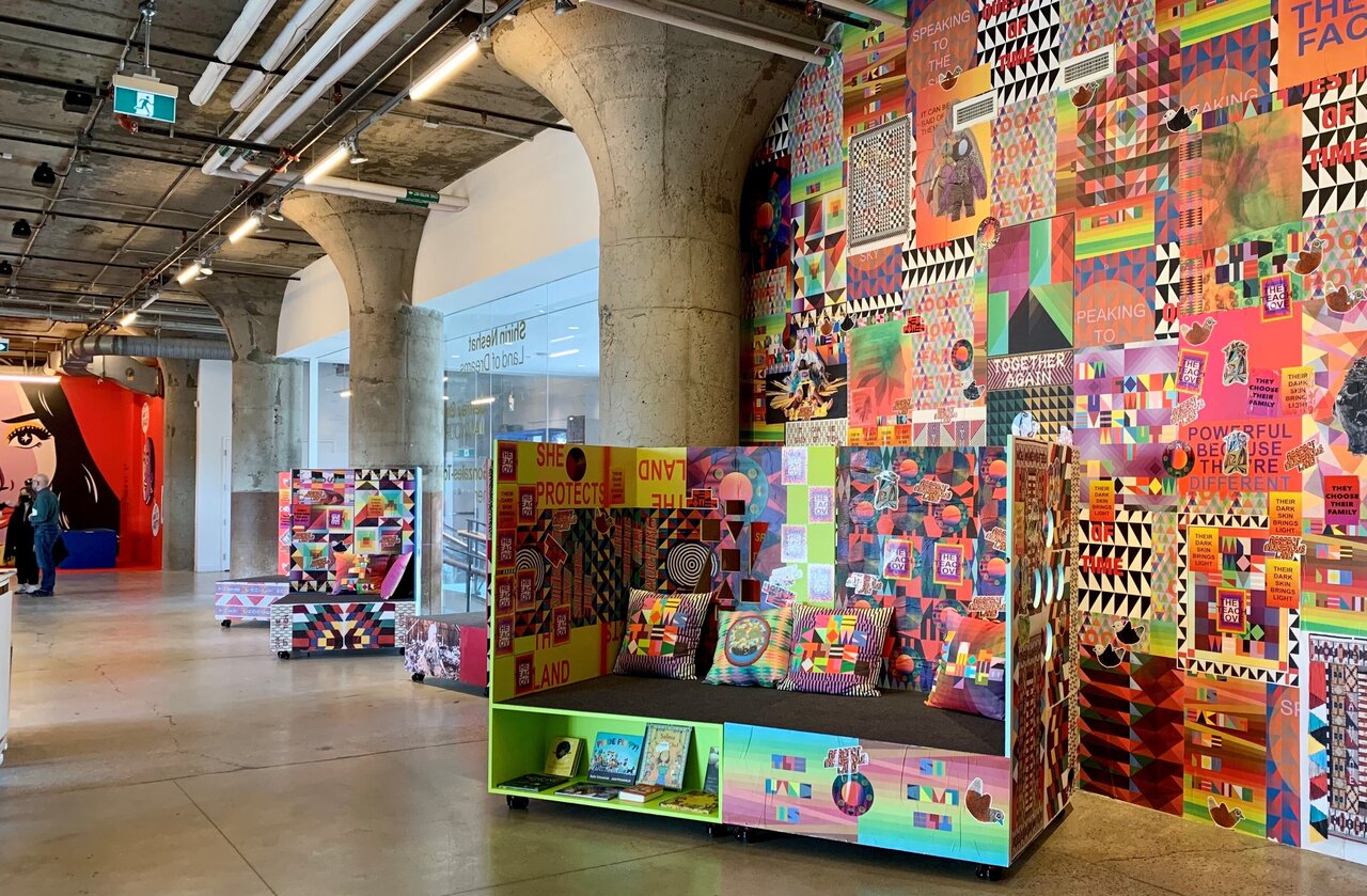 Co-commissioned by the Toronto Biennial of Art and the Museum of Contemporary Art Toronto, I AM YOUR RELATIVE is located in the lobby of the MOCA, though perhaps ‘located’ is the wrong word. It is the lobby; open for free viewing to all who pass through, making it both symbolically and physically accessible to the public. Neon green walls have been plastered with posters and stickers in vibrant pinks, purples, reds, blues, and just about every other colour. These designs are also detailed on the fifteen moveable platforms and cushions that provide seating for the community, storage for locally sourced children’s books, and flexible stages for performances and community programming.