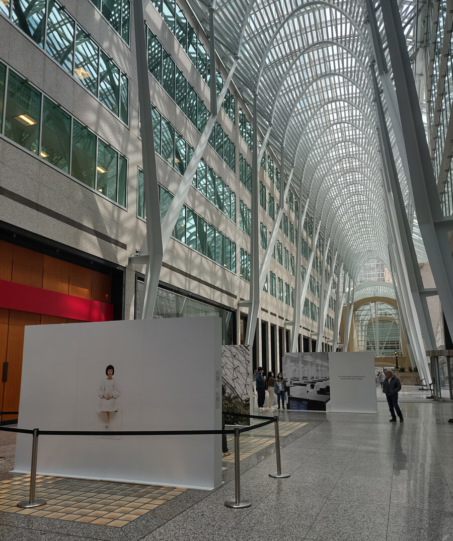 Entering the Allen Lambert Galleria at Brookfield Place, sunlight penetrates and illuminates the exhibition through the beautifully designed Santiago Calatrava structure. Ambient music weaves quietly through the cavernous space.