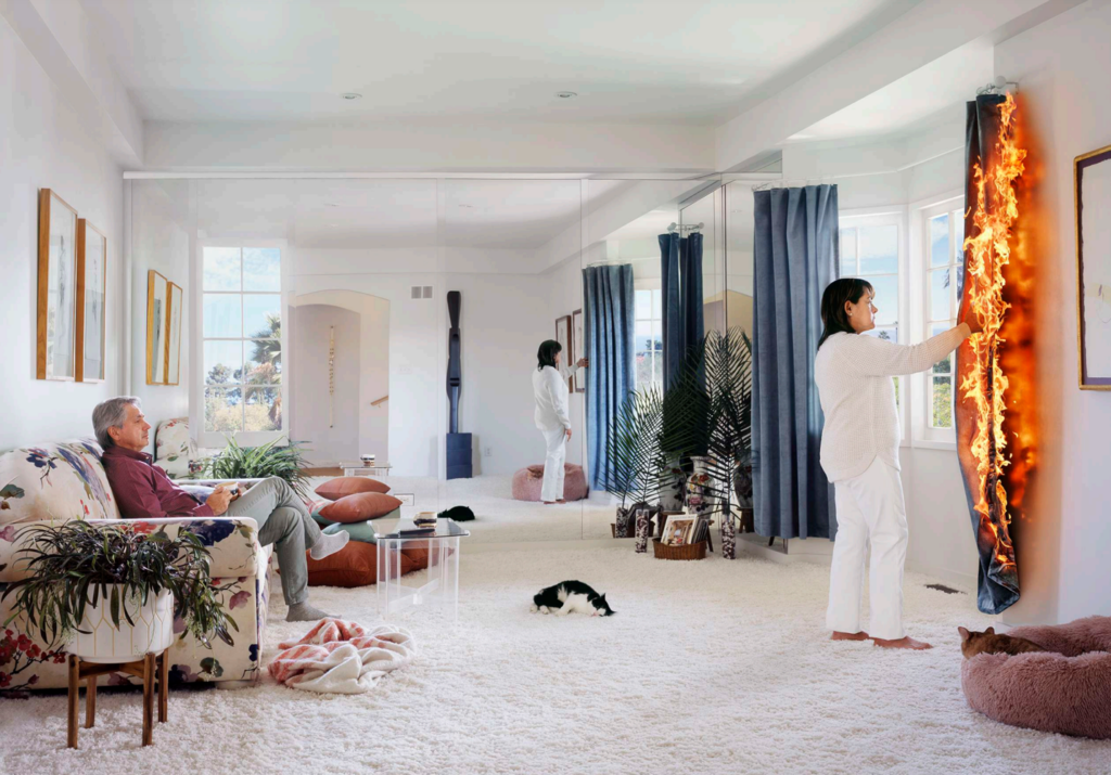 I like the play between mirror and reality in Charlotte’s Hallucination (2022). In the real world, Charlotte believes that the curtain is on fire while in the mirror, the supposed reflection of reality, there is no fire on the curtain. In addition, the man is not shown in the mirror, so is he really there or is he Charlotte’s hallucination too? This image again entails an unnatural feeling which perhaps alludes to the broken or concerning relationship between the couple.