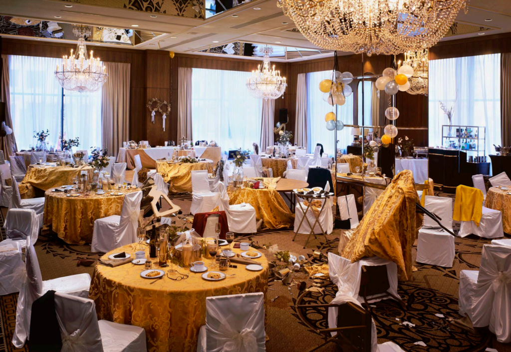 In the artwork At a Moment’s Notice (2021), it shows how an image without people can tell a powerful and unsettling story. The scene shows what seems like a deserted party in a luxurious banquet hall. Personal belongings such as glasses, cameras, and coats are left behind to convey a sense of urgency, hence the name at a moment’s notice. The viewers cannot help but imagine what happened at this party. Things must be intense with fallen tables and chairs, dishes on the floor, and unfinished food and drinks. It is interesting that the setting is during daylight, but the chandeliers are turned on and it further emphasizes the fact that people do not have the chance to turn off the lights. It feels like everyone is suddenly gone and this sense of immediacy highlights the feeling of loneliness.