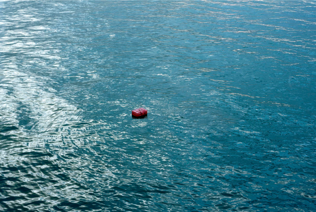 In contrast to the chaotic environment, Border Crossing (2022) portrays the vast ocean with a red suitcase floating in the center. The whereabouts of the owner is unknown and probably very far from the suitcase. Again, the artists produce this unease narrative of someone trying to cross the border by sea, which contrasts the beautiful but also isolated sea.