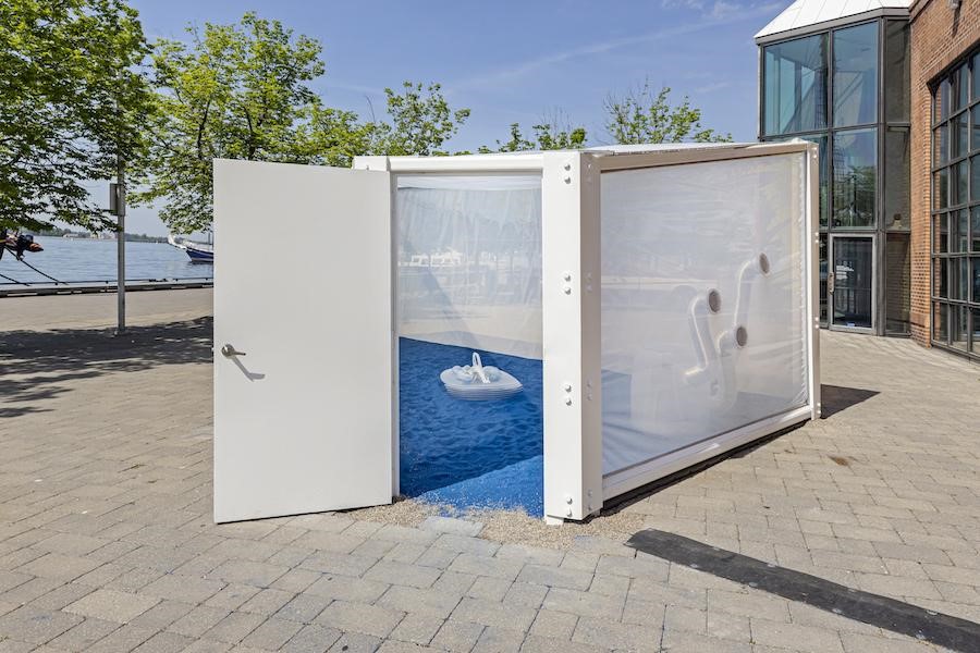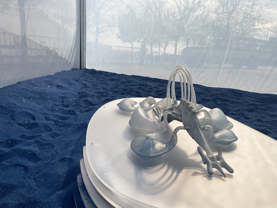 Marguerite Humeau, an artist interested in the transition between animals and minerals, has contributed a post-modern sculpture titled Waste I – 1 (a respiratory tract mutating into industrial waste) placed at the center of the installation. The creature seems to have taken the shape of the human vertebral column, with the addition of eight prominent air chambers. With Donna Kukama’s pre-recorded audio imitating the respiration process, the tube inlaid on the back of the futuristic creature also seems to be breathing air in and out. Among the vast blueness of sand, placed on a transparent base, the sculpture seems to be on an isolated island in the middle of the ocean, radiating loneliness and helplessness.