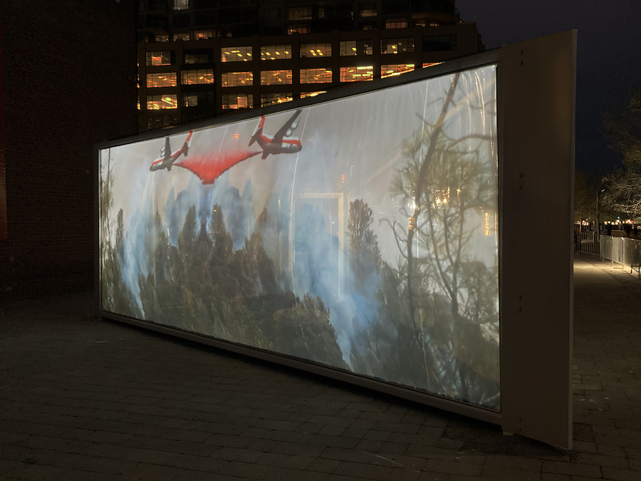 Every day after dusk, Julius von Bismarck’s video installation Feuer mit Feuer (Fire with Fire, 2021) will play directly on the transparent pavilion from multiple angled projectors. Multidisciplinary artist, von Bismarck’s practice is defined by an in-depth and complex exploration of the phenomena of perception and experimentation. In his video he captures the boundless beauty of the powerful and devastating elements of fire. In order to complete this video he visited many fire sites in Germany, Sweden and across California. When viewing the glowing artifact at night, audiences may take a step further away from it to see its full-screen projection. People can enter the flaming forests by fully immersing themselves in its fire and smoke.
