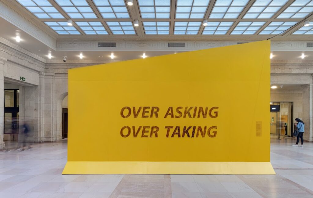 Lisa Myers Overture is a visually striking commissioned piece that addresses ongoing colonialism and consumerism. Using blueberry pigment, the words OVER ASKING and OVER TAKING are written in block letters, on a yellow background confronting wealth and land ownership, and the ramifications of inflation in real estate practices. This work has a large presence as it can’t be missed by those walking by. It makes us aware of the uncomfortable truths of land practices.