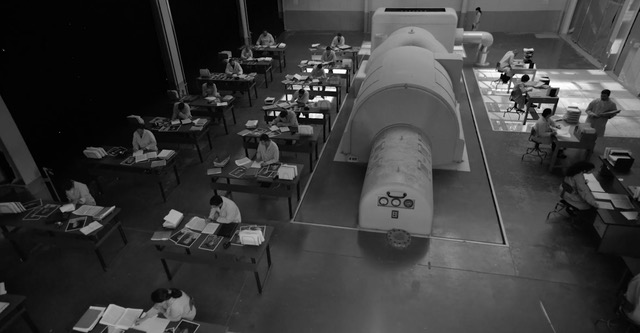 Shiprock mountain in New Mexico was selected as the mythic site for The Colony, while the actual filming of the inhabitants took place in a power plant. The crew had been scouting for a dark, claustrophobic setting for the paper-pushing bureaucrats, but were delighted with the atomic bomb-facility ambiance of the power plant. Here, rows of lab-coated dream catchers could quietly go about their business of cataloguing and analyzing the dreams of the residents of a nearby town. It took a week to cast and photograph the actual 200 New Mexico residents from which the photo-based component of Land of Dreams of were drawn.