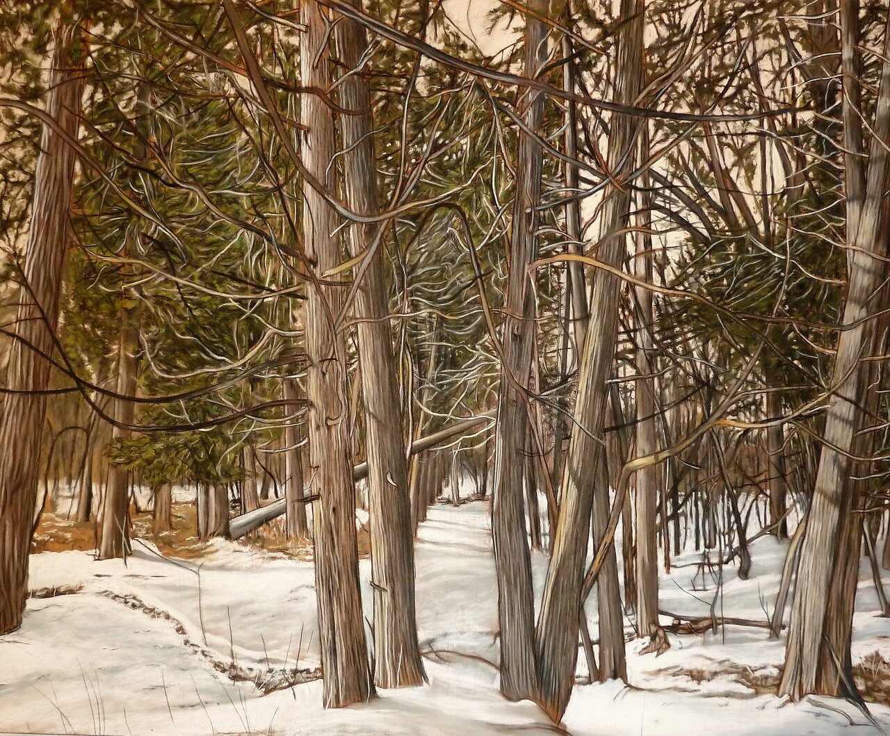 Alcock knows his trees very well. He studies them for a long time, returns to them again and again. Sometimes he travels to far distances to visit a special one, as he did this summer by going to the Bruce Peninsula National Park just south of Tobermory. As he said, there, along the cliffs on the coastline, are many white cedars that are centuries old. The oldest recorded is 1,300 yrs-old, making it one of the oldest in Canada. The whole of the peninsula and the Georgian Bay area generally was clear-cut in the 19th century. The cedars in the park survived only because of their inaccessibility, making them economically unviable. So in this historical sense, as well as their age, they are rare. “I seek these original growths out because of my interest in nature ‘stripped of our concerns and preoccupations’ as I put it in my statement”. His love of trees goes beyond their static presence as he sees them moving in the wind, changing their shape, each with their own beauty. Every work shows its own attention to detail, some more dense than others but all stand their ground with their own quiet appeal.