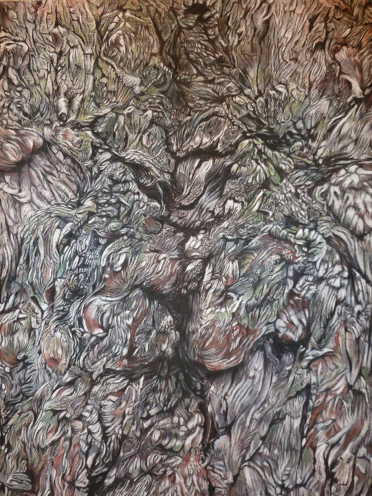 Hugh Alcock, In Memoriam, Study of Willow Bark, 2020, charcoal & pastel on wood, 48″ x 42″