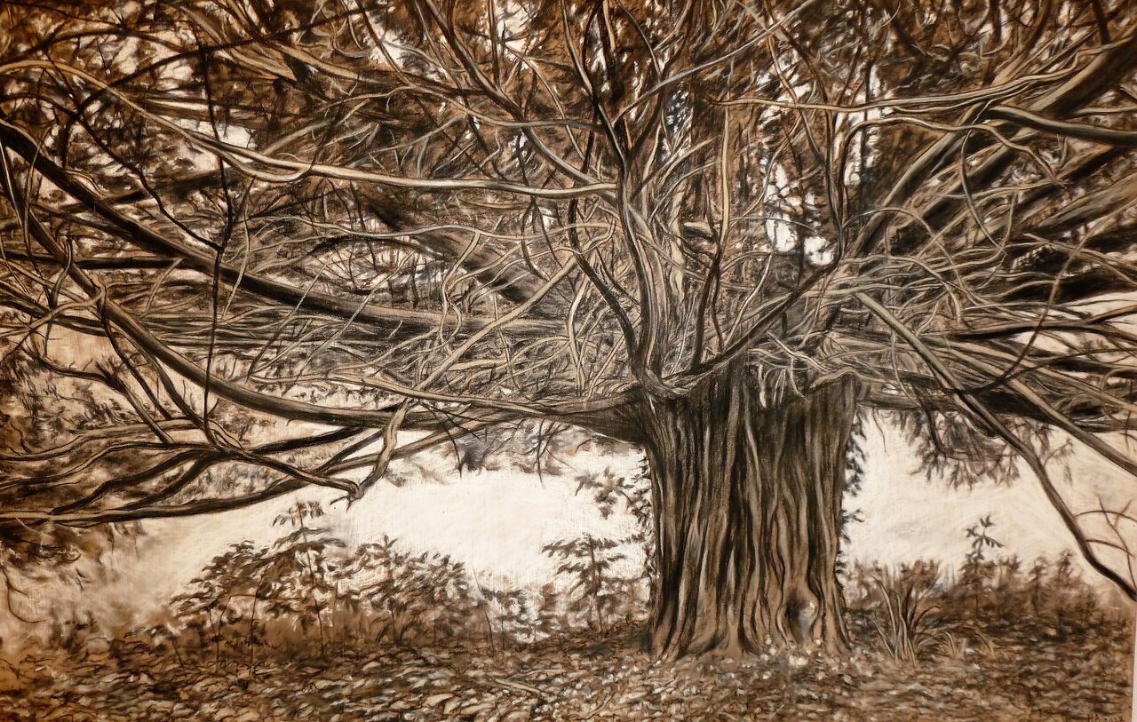 Hugh Alcock, Yew Tree, 2022, pastel and charcoal on wood, 32″ x 48″