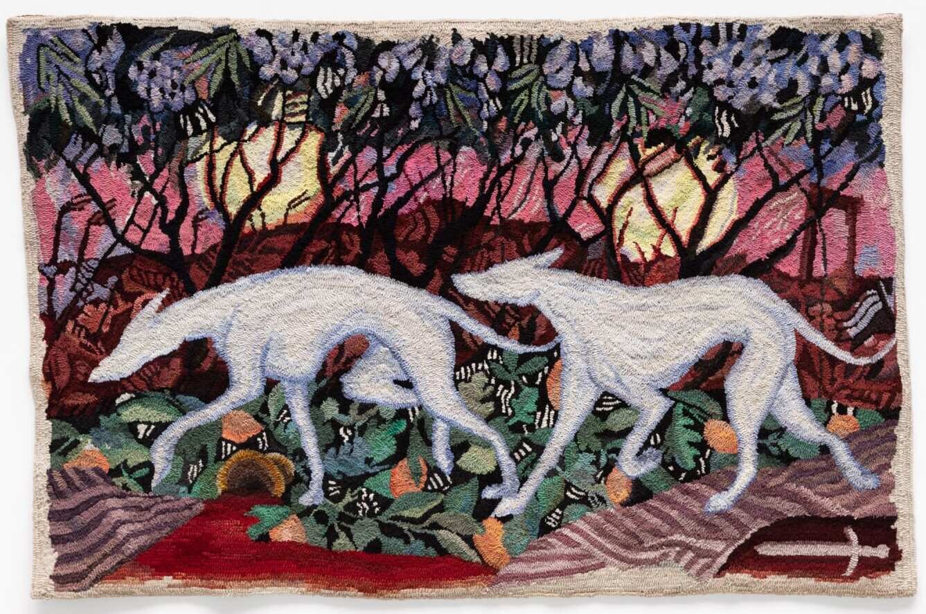 Heather Goodchild, Ghost Dogs, 2022, dyed wool and burlap, 41 x 62 inches