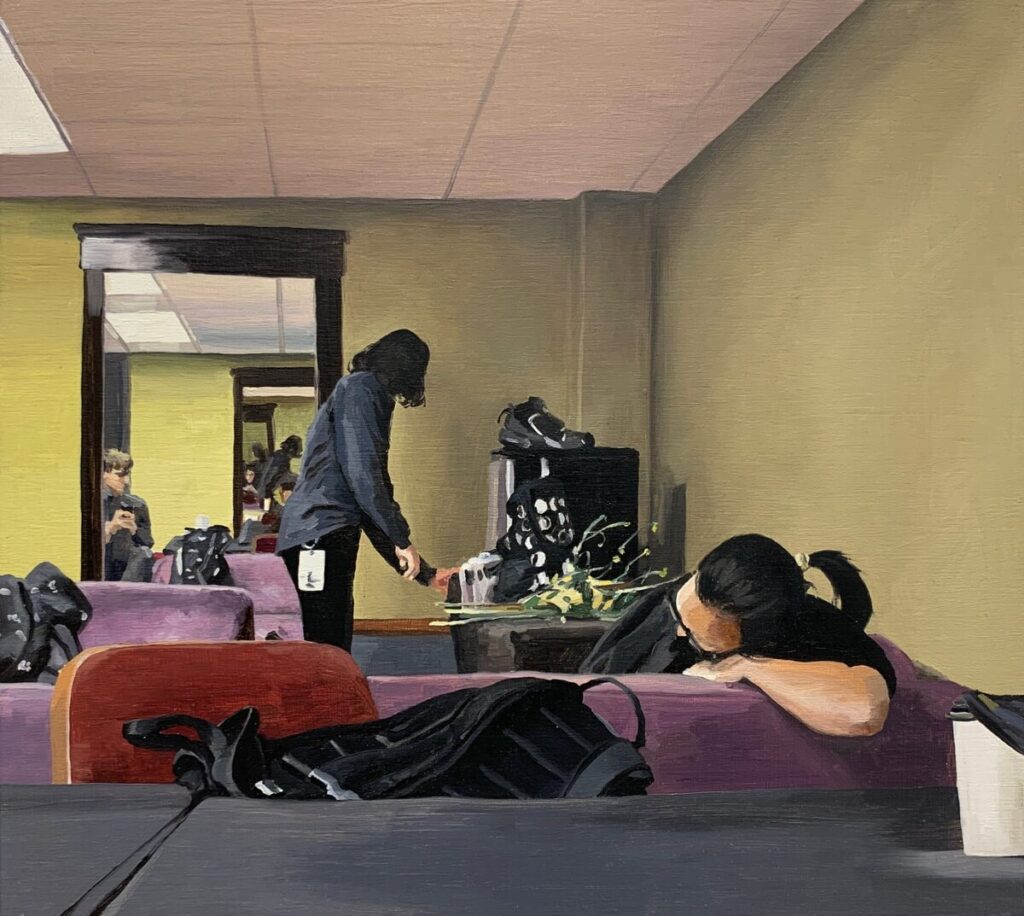 These are the sorts of scenes that make up our mundane daily experiences, including cafeterias, the door to a friend’s apartment, the basement stairs in a public building and so on. Their scale forces Goodchild to render them loosely, which, together with the intimate details they each depict, adds to their dreamlike quality.