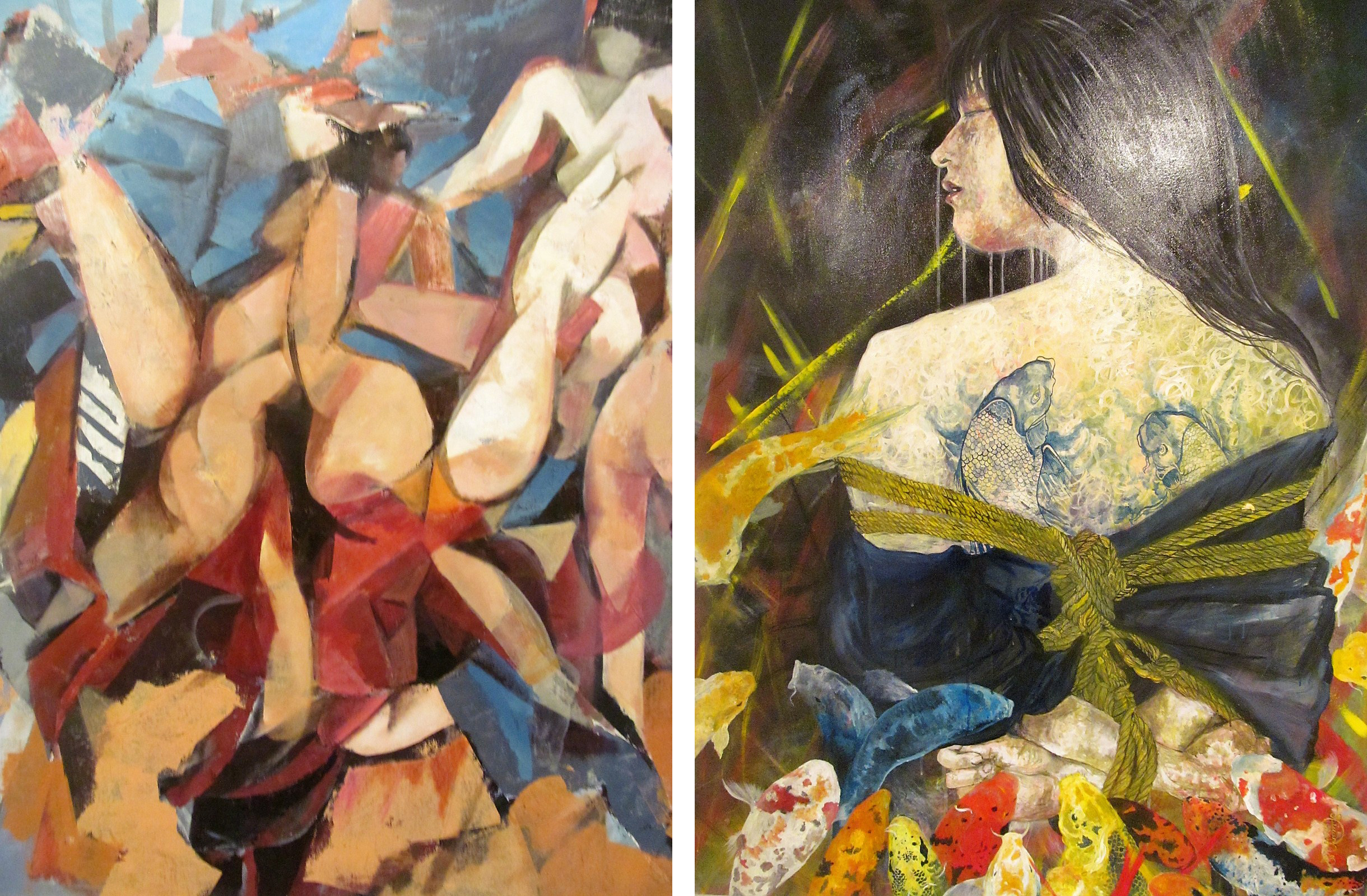 Farrouh Nooroney, Coastal, 46″ x 38″ (left) & Lillian Chow, Don’t Be So Koi, acrylic on canvas (right)