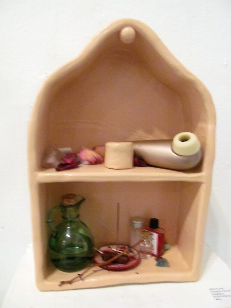 Another aspect of sex highlighted in the show is what Yasmeen Kazak calls its sacredness. We are told in her statement that she “is largely inspired by her experience having struggled with shame and autonomy as a young woman, and eventually finding that her body, sexuality, and personal space are sacred to her”. She presents to us a shrine-like split-level construction, whose shape and colour subtly allude to a vagina, titled Altar/Sacred. On its shelves sit various objects associated with sex, the body and pleasure. Its scale perfectly communicates a sense of intimacy. A lovely work altogether.