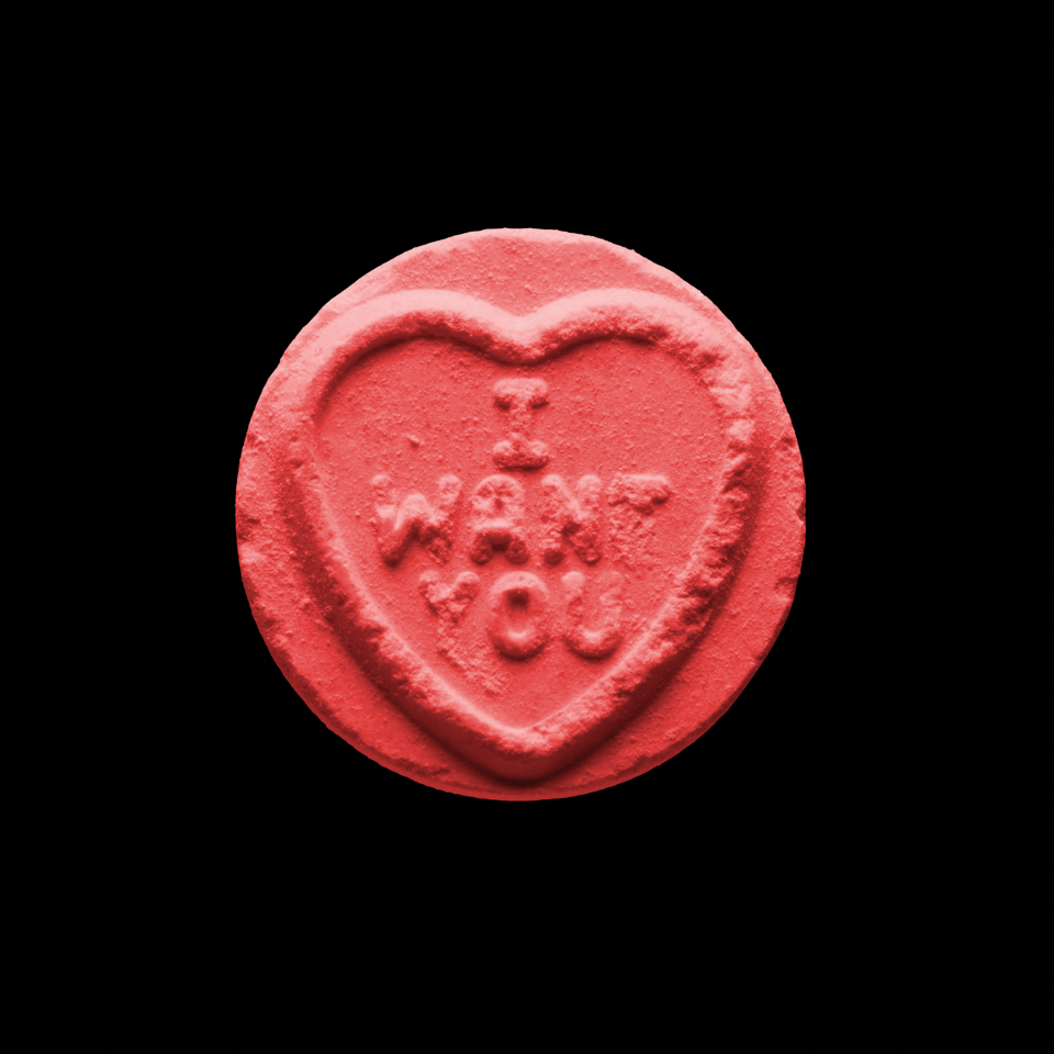 The deep desires concomitant with sex are cleverly alluded to by Tommy Feiler’s photographic print titled I Want You. These are the words written in relief on a candy, blown up to many times life-size. Feiler’s work generally focuses on such everyday items. He encourages the viewer to scrutinize them. Here we enjoy the gaudy pink colour and the heart shape design around the words. It points to a delectable connection between food and sexual desire.