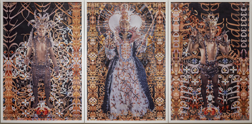 Julius Poncelet Manapul also addresses sexual identity issues in his triptych, Whitewashed Bakla in the Presence of the Rice Queen (2017). The artwork, especially the two male figures on the sides, brings to mind Carnival in Rio de Janeiro, with its crowded composition, the use of masks and decorative ornamentation. The male figures’ outfits combine Indigenous Ifugao, Igorot and Ilocano attire designed from paper templates of butterflies, often used in the Philippines. Their faces are half covered by Asian masks. The Rice Queen in the middle reminds me of renaissance portraits of queens as well as sculptures of the Virgin Mary dressed for a religious procession, carried by singing believers. All the figures are paper cut-outs, framed by butterfly motifs combined with skin whitening products and gay porn elements. The references to Spanish culture are strong as the artist comes from a Filipino background, where the Spanish influence and domination is still present. Manapul’s works show the artist’s opposition to colonialism, European hegemony and sexual normativity.