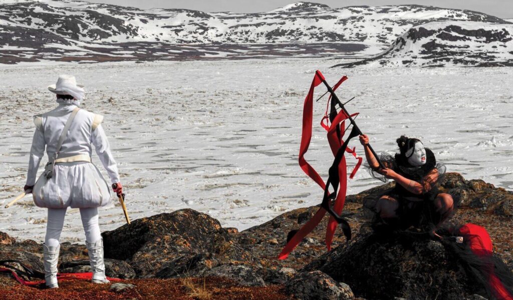 Like in Tyrell’s work, power is a central element in White Liar and the Known Shore: Frobisher and the Queen (2021). This monumental and theatrical composition, is a collaborative artwork created by Laakkuluk Williamson Bathory (Inuk) and Jamie Griffith (Canada, UK), two multidisciplinary artists based in Iqaluit, Nunavut. In an almost unrealistic landscape, depicted in the winter in Nunavut, when the water is frozen and the mountains are covered by snow, two figures appear. Griffith adopts the persona of the English explorer Sir Martin Frobisher. He is the White Liar, wearing the white clothes of the Elizabethan era, holding a gun in his hand to symbolize his power and cruelty. He is standing with his back to us. Williamson Bathory impersonates Queen Elizabeth I with her famous white make-up that also refers to whitened bones, an Inuit symbol for respects to ancestors. Her dress somewhat mimics Elizabeth’s style, especially the collar but the red color could be associated with blood. She holds a red and black flag that originated in the Greenlandic mask dance. She is turned in the opposite direction from Frobisher. Her facial expression shows anger and fear, screaming into the distance. The entire composition gives me an uneasy feeling. The two figures are not related in any way. The color code is also worrisome, with the whiteness of the land and Frobisher’s clothes juxtaposed against the dominant red of the Queen. We can’t see Frobisher’s face as he looks at the empty, rigid land. There is no welcome from the land or the people. It is an isolated place with people who wanted to left alone. What does he want from this land? In reality, what he got was fool’s gold, a useless rock that the British mistook for real. Fortune seeking went wrong here but colonialization remained, causing the Indigenous people suffering in their own land historically and into the present.