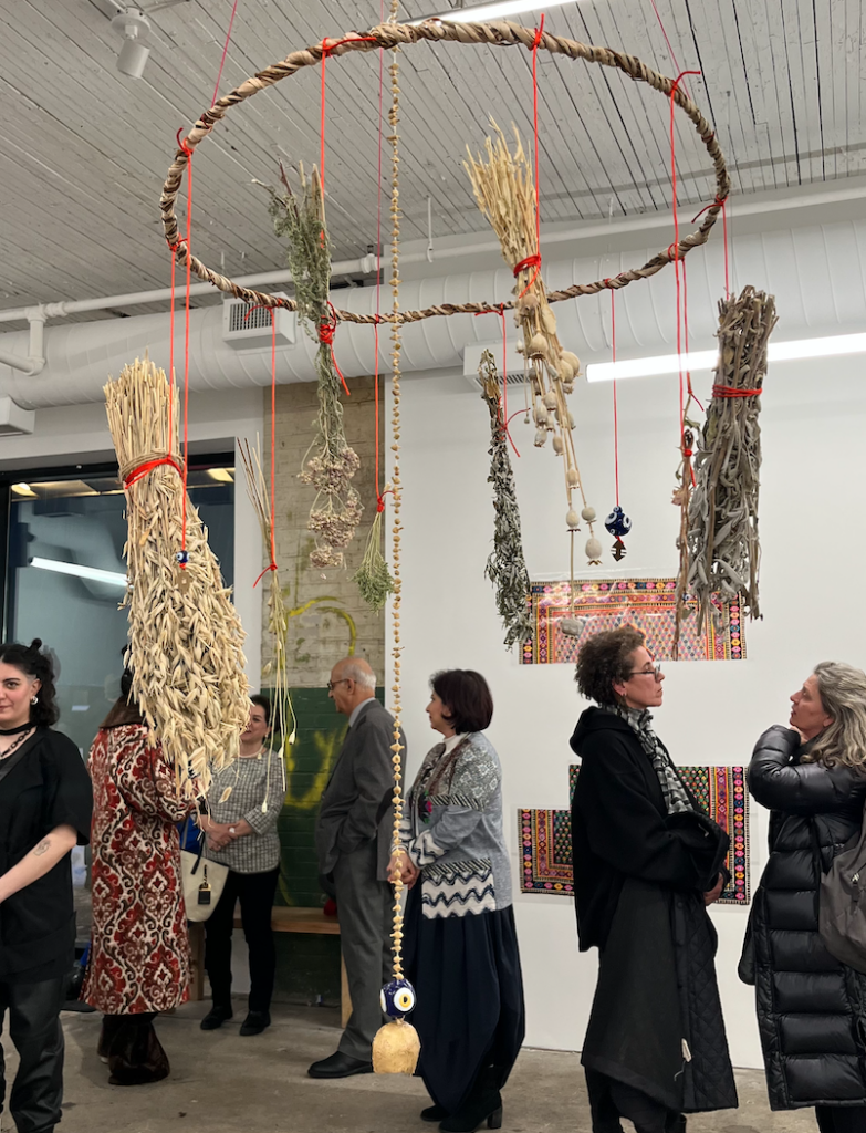 On the floor at the centre of The Next Contemporary’s fresh industrial space at 1655 Dupont Street are a series of rugs by Alize Zorlutuna arranged in a circle. Hanging above them is a chandelier created from dried herbs and plants, strung together with flowers and beads. Visitors radiate around this central exhibit, slowly moving between the exposed pillars that break up the space.