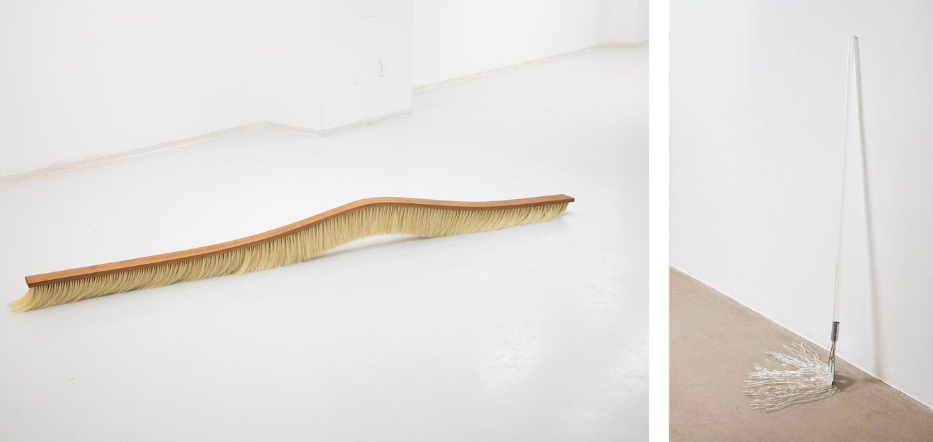 L-R: Diyar Mayil, Sweep, cherry wood, natural fibers, 2022 & Dustpan, glass, gold, 2021