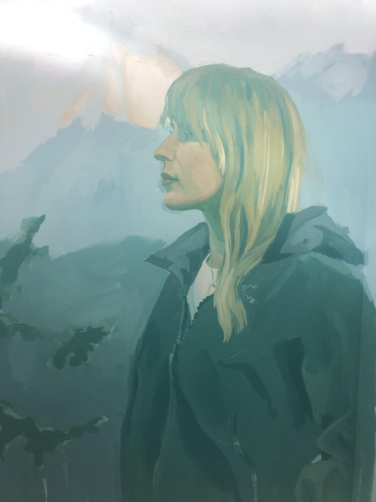 The first piece to draw in the crowds is the recently-dried self-portrait, created in the early hours of the opening day. This mural portrays the artist in her element: among the mountains enjoying a quiet moment, and it’s particularly apt for this show as it painted directly on the gallery’s wall, making its lifespan transient too.