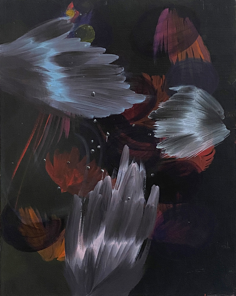 In Botanical Mechanics 13 silvery brush marks, like feathered wings, obscure darker, spectral objects behind. In the foreground there’s a constellation of small dots rendered to appear spherical. ‘Mechanics’ in the title might lead you to consider these objects as distant stellar bodies or possibly microscopic particles. Are we dealing with celestial mechanics? Or quantum mechanics? Possible interpretations multiply the longer you look. Could these spheres be bubbles; are we under water? Or are they droplets on a glass surface?