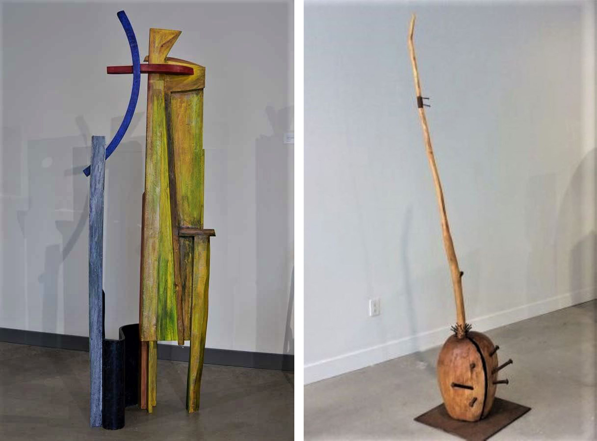 Edward Falkenberg, Outstanding, wood, pigment (left) and Jim Maunder, Intervention, wood, steel, nails (right)