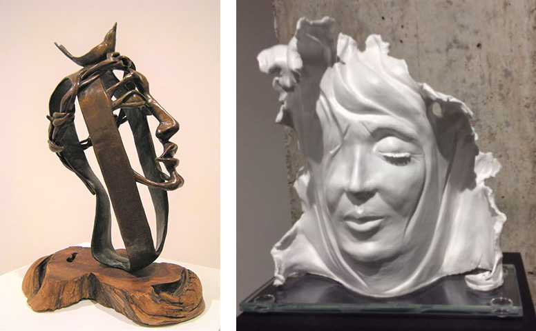 The portraits of Karen Stoskopf Harding and Marlene Kawalez are beautiful and ethereal. Kavalez painted her clay piece white giving it an angelic appearance. Stoskopf Harding uses strips of metal to create the woman’s face, involving air as an element, giving us the feeling of light shining through. The little bird on the top of the head invites the light with its song.
