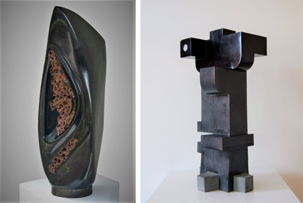 Angela Verlaeckt Clark and Daniel Yu capture our attention with the dark beauty of their sculptures. While Verlaeckt Clark’s composition is smooth and curvy, Yu’s is edgy but both have movement in them.