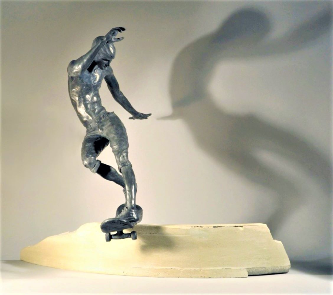 All of W. W. Hung’s sculptures are about movement. The young man atop his skateboard in the sculpture balances in the air, with the his body curving right and left, creating a perfect balance choreographed like a dance.